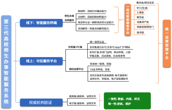 『正脉第三代高校师生办事智能服务系统』由线下智能服务终端提档升级至“线上:智能服务平台+线下:智能服务终端+统一运维管理平台+权威验证”四部分组成,集成师生中英文成绩单证明文件基于线上/线下、纸质版/电子版统一数据、统一样式、统一验证,实现高校多校区、多部门师生服务事项统一运维管理。
