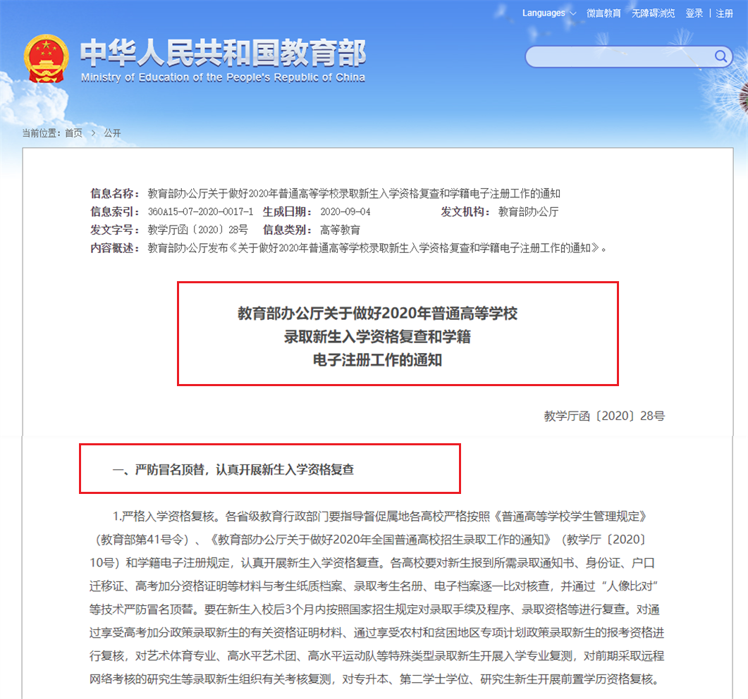 ▶历年权威机构验证、各省教育厅发布《关于做好录取新生入学资格复查和学籍电子注册工作的通知》文件中,要求认真开展新生入学资格复查,并通过“人像比对”等技术严防冒名顶替。