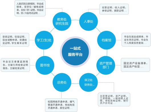 师生可通过自助操作完成一系列与其个人相关的业务办理进行多部门应用,考务处、学工(生)处、图书馆、总务处、保卫处、财务处、资产管理、档案管理、人事处等多部门,可使用扫码验证功能自助完成各类证明材料的真伪验证,实现多部门一站式服务。